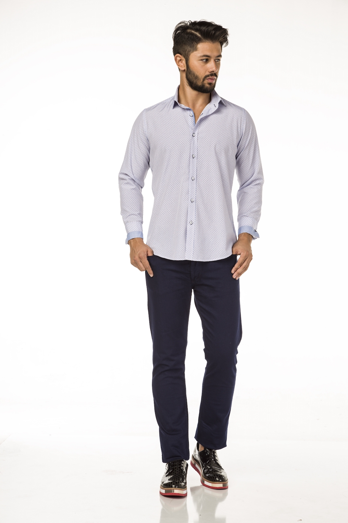 Das Hemd mit kleinem Haifisch-Kragen kann leger in der Freizeit oder auch mit Jackett im Büro getragen werden. Das Grundmaterial, ein gewebtes Karo, wurde mit einem All-Over Druck veredelt. Die inneren Manschetten und der Kragensteg wurden mit Kontrast-Mustern belegt. Die innere Knopfleiste ist mit einem perfekt abgestimmten Web-Band gearbeitet.