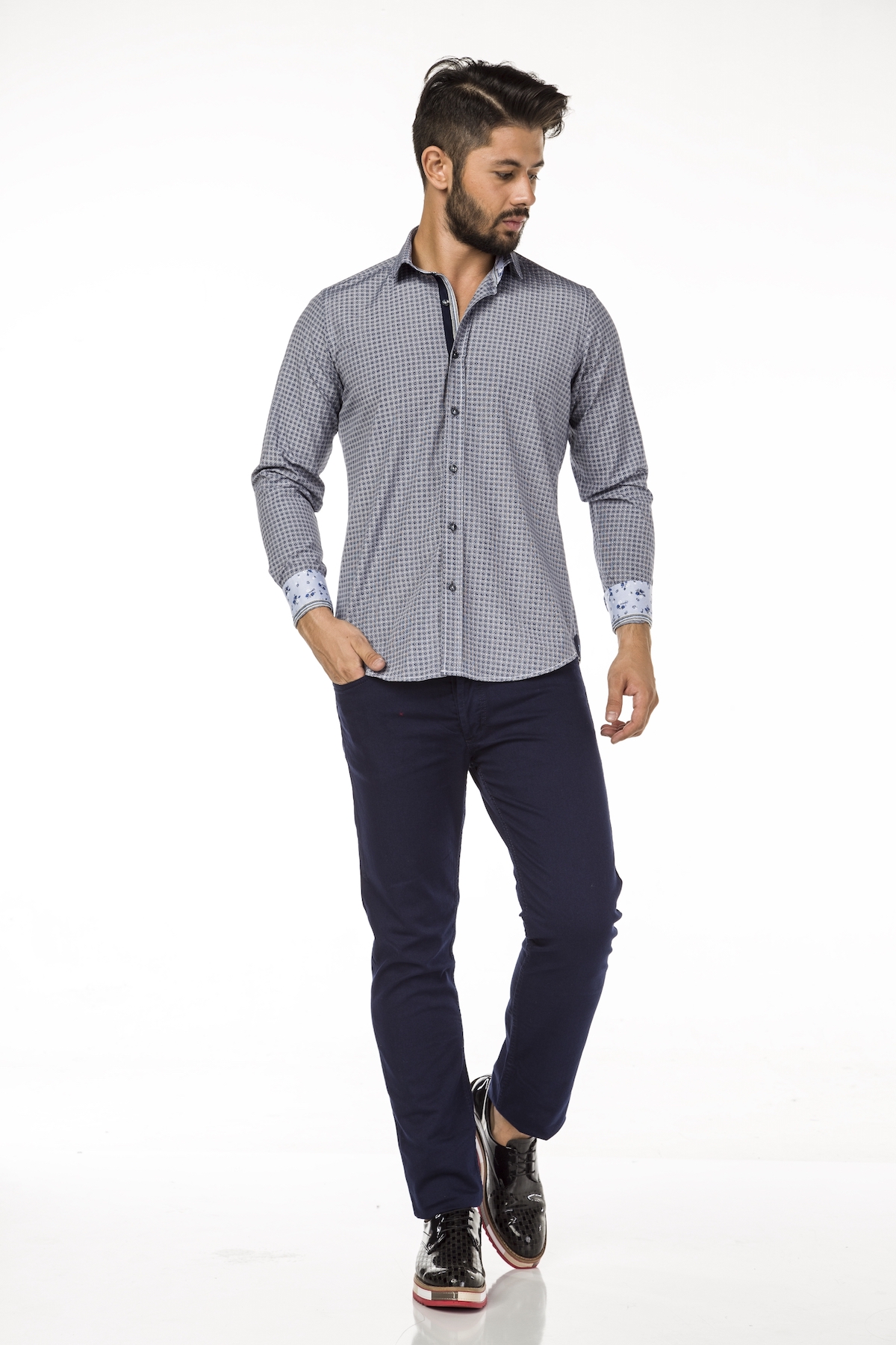 Das Hemd mit dem hoch-modischen, kleinen Haifisch-Kragen setzt Maßstäbe. Das kleine gewebte Karo wird durch aufgedruckte Muster zum modischen High-Light. Die innere Knopfleiste ist  durch ein gemustertes Band veredelt. Die Manschetten sind innen mit einem gedruckten Kontrast-Stoff und mit einem passenden Web-Band belegt. Eine schmale Uni-Krawatte wäre ein passendes Accessoire.