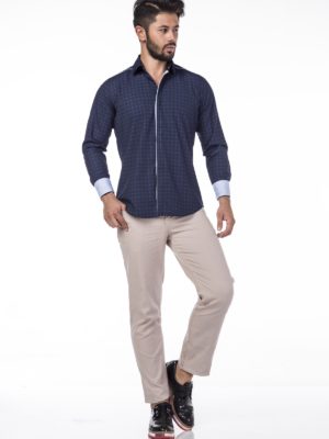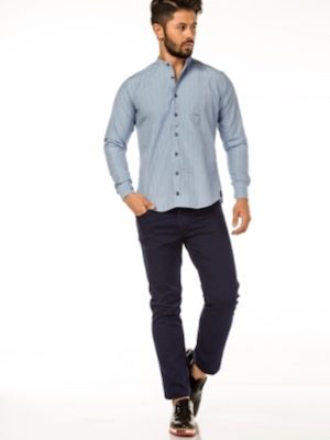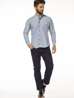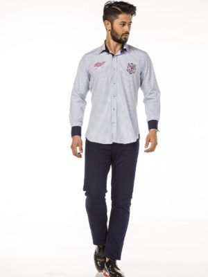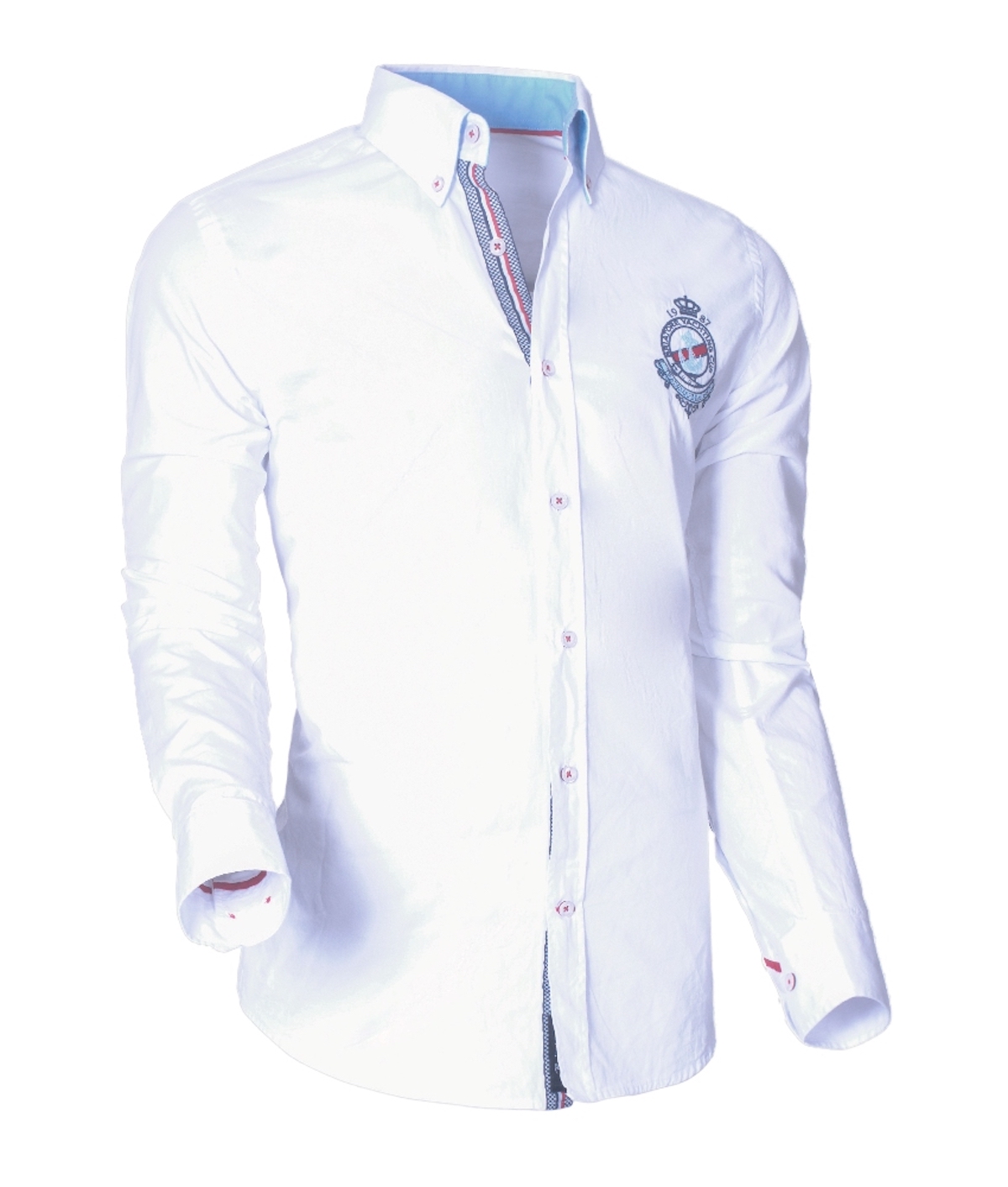 Zeitloses Dessin trifft markante Details. Dieses Uni-Hemd begeistert durch  die detailreichen Stickereien, kombiniert mit farblich abgestimmten Bändern entlang der inneren Knopfleiste. Die kleine Logo-Stickerei und der farblich abgesetzte Aufstell-Kragen sind weitere Highlights.
