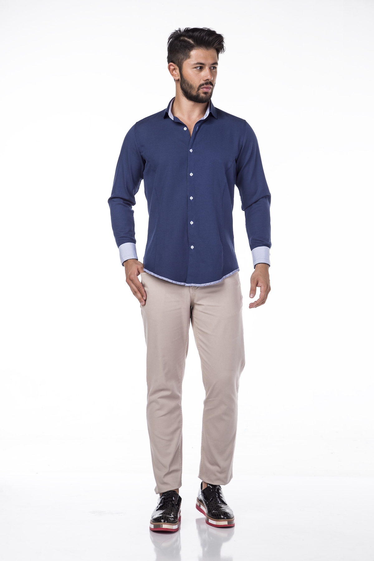 Das Hemd mit dem modisch kleinen Kragen und dem strukturierten Stoff passt perfekt zum legeren Sacco, als auch zur ausgewaschenen Jeans. Eine schmale Krawatte  wäre ein passendes Accessoire. Der Kragensteg innen wie auch die Manschetten innen sind mit Kontraststoffen veredelt. Handziersteppnähte setzen einen zusätzlichen Akzent.